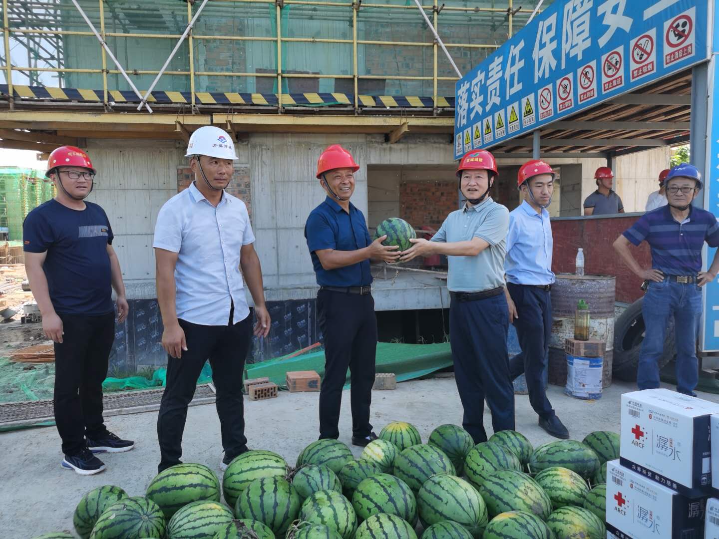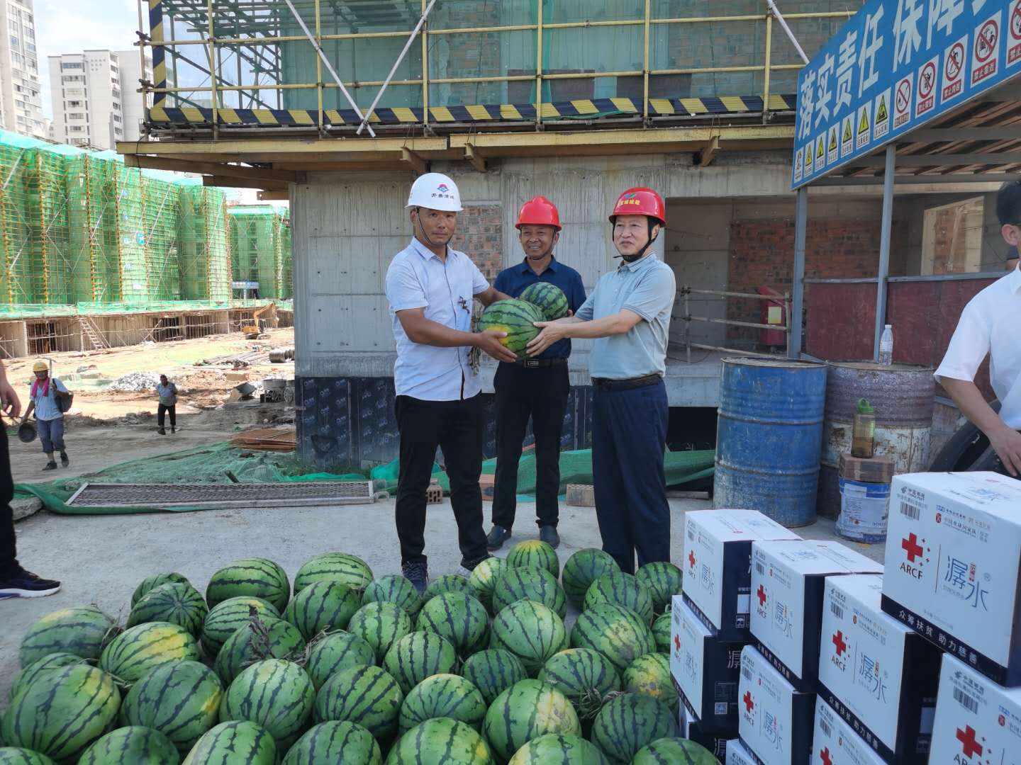 烈日炎炎,驕陽似火,近期宣城持續(xù)高溫,為加強盛夏期間安全生產勞動保護工作,保證一線人員的身心健康,8月13日上午,市城建集團總經理衛(wèi)民深入中央公園、方家沖小區(qū)、澄江新村三期、四期等在建工程項目現場,為一線人員發(fā)放礦泉水、西瓜等防暑慰問品,并送上公司的親切慰問。同時要求高溫期間各在建工程一定要合理調整工作作息時間,嚴格落實主體責任,確保各在建項目平穩(wěn)有序推進!