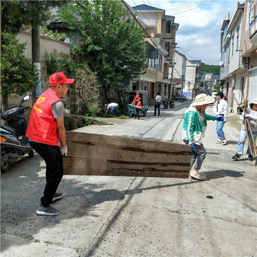 2019年7月,李夏(左)在安徽省績溪縣荊州鄉(xiāng)方家灣村走訪群眾時(shí),幫助村民整治衛(wèi)生環(huán)境。新華社發(fā)